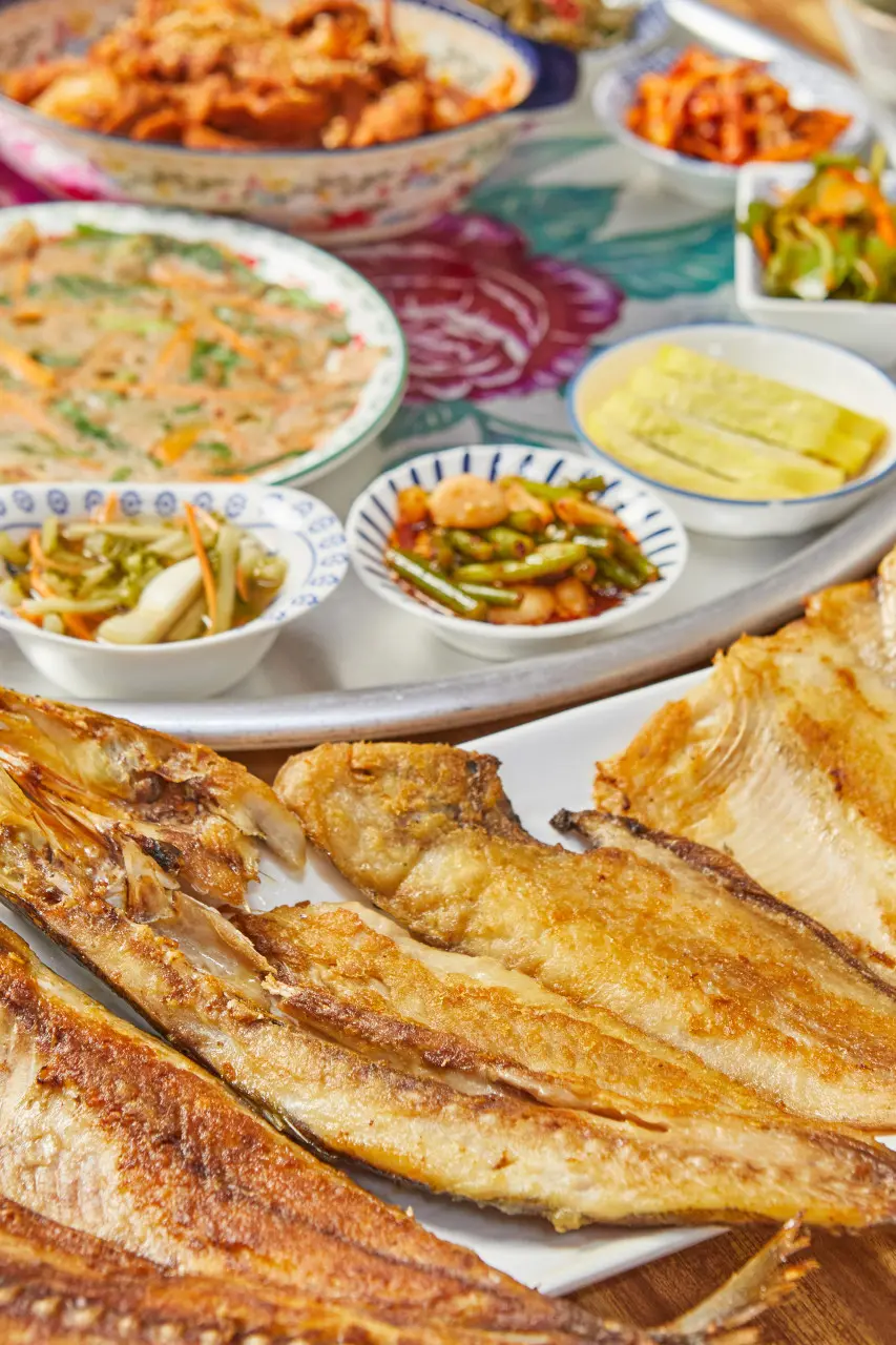 그날 잡은 각종 생선구이 모둠, 제육볶음, 김치전, 기본찬 10여 가지, 밥·국 무제한 셀프바 | 2인 이상 주문 가능, 1인 약 15,000원 선으로 다양한 생선구이를 한 번에 맛볼 수 있어 가성비 좋다는 평가 | 8세부터 1인 1메뉴, 7세 이하는 2인 1메뉴 기준 주문 |