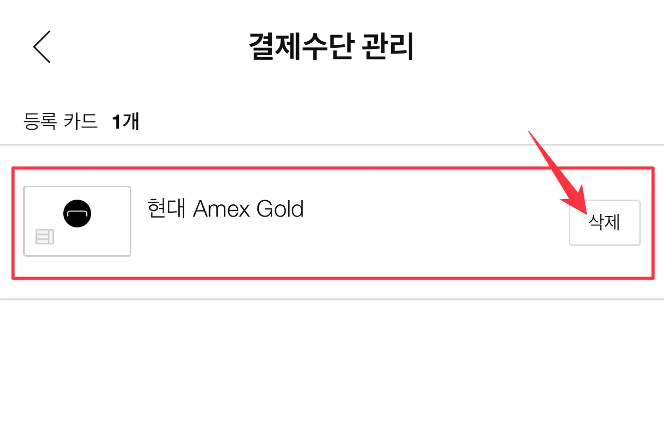 결제수단 관리 화면에서 카드 옆의 삭제버튼 클릭