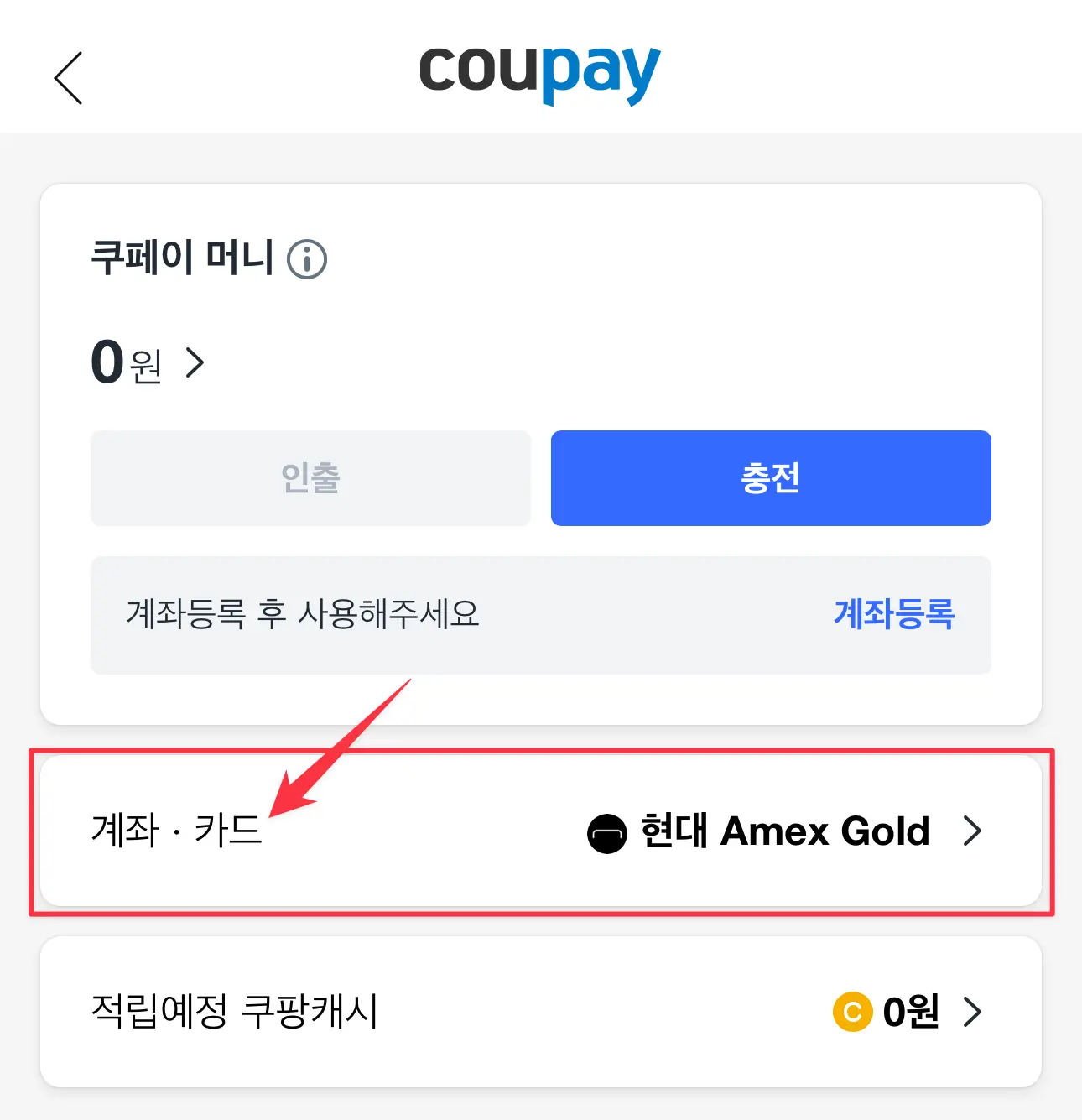 - 상단 전체 메뉴→ 결제수단 → 계좌·카드 클릭