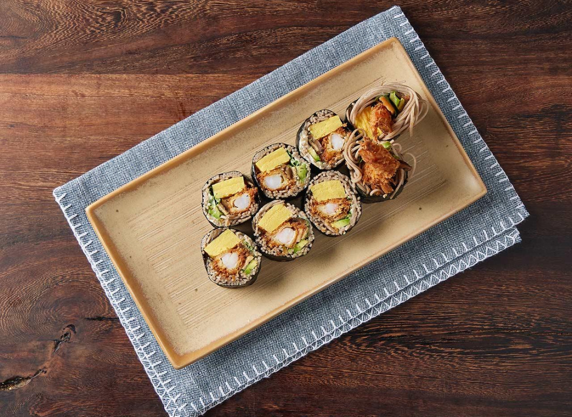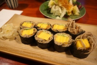 - 밥 대신 메밀면으로 속을 채우고, 큼직한 달걀말이(다마고)와 우엉·오이·아보카도를 함께 말아낸 독특한 구조입니다.