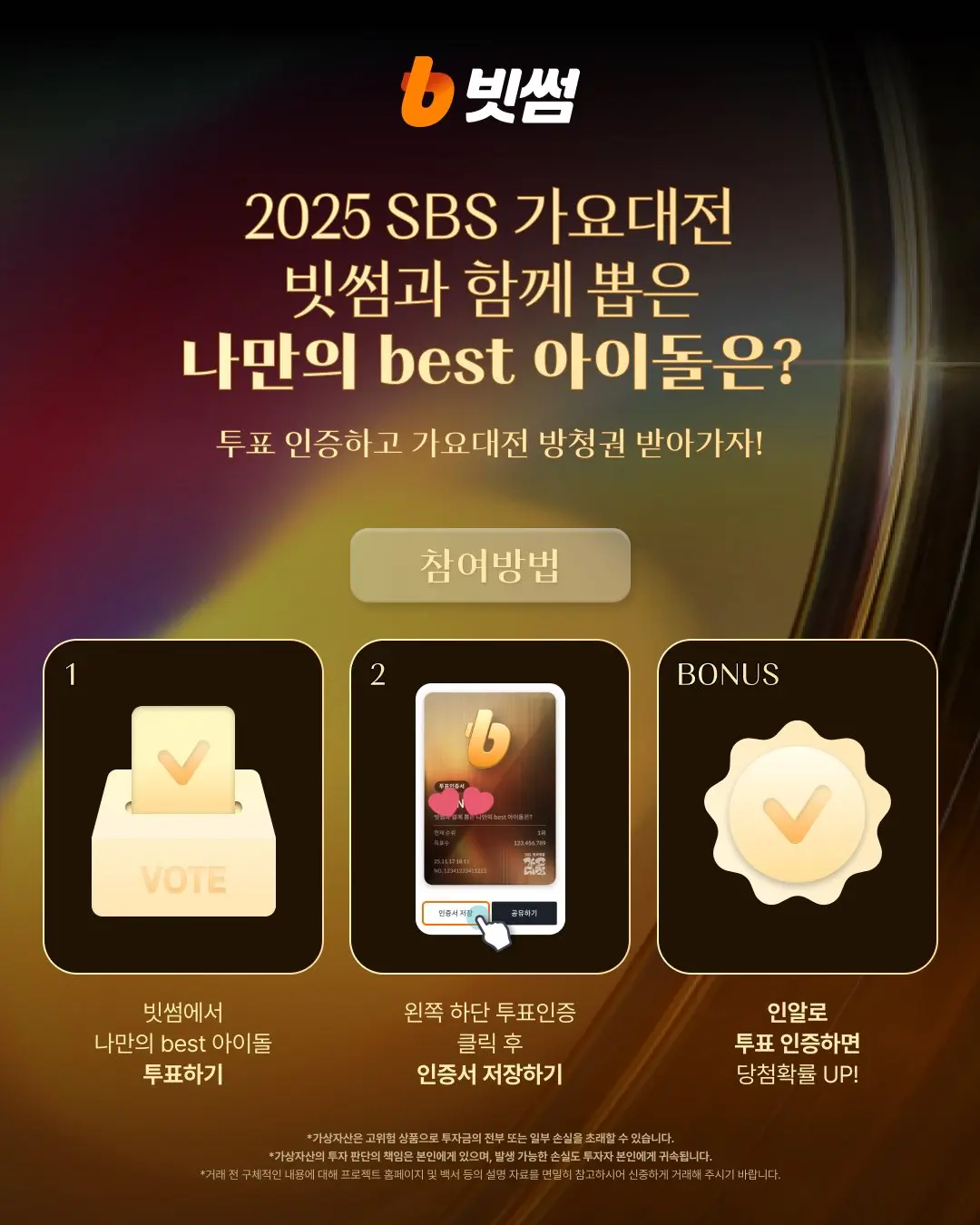 지금 바로 빗썸 스페셜 투표 참여해서, 올 연말을 가요대전과 함께 완벽하게 마무리해 보자고요!